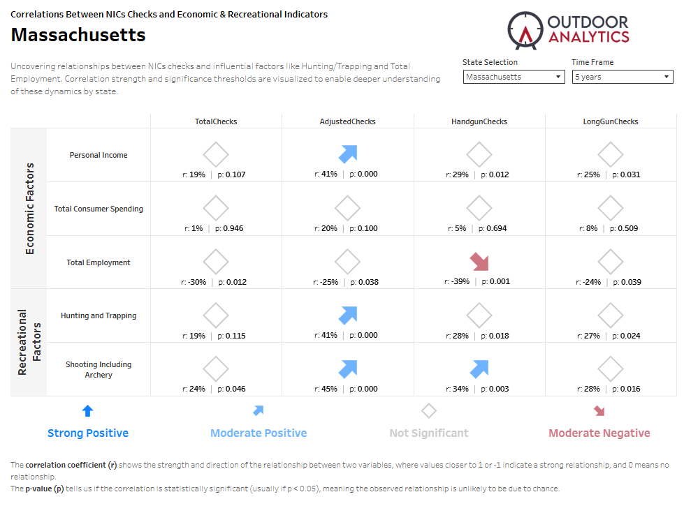 What do gun background checks in Massachusetts have to do with paychecks, jobs, and days spent outdoors? Our latest Tableau snapshot connects the dots. Looking at five years of data, we see clear patterns between NICS checks, the broader economy, and recreational activity like hunting and archery. Below, I’ll break it down in plain English—no spreadsheet headache required.